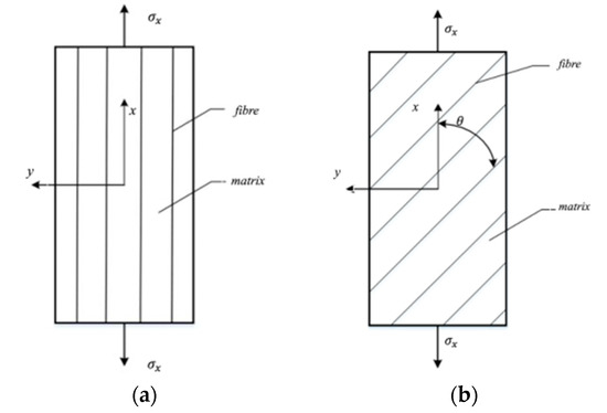 Generally, tensile loads are applied along one of the principal axes of unidirectional composite laminates to measure the fibre tension or transverse tension properties (Figure 1a). In the off-axis tension test, the tensile loading direction is neither parallel nor perpendicular to the fibres. Hence the stress states correspond to the materials’ principal axes are tension and shear mixed (Figure 1b). The off-axis tension test of fibre reinforced composites can be used for the characterization of the mechanical behaviour under multiaxial stress states. Hu et al. [15] conducted on-axis and off-axis tension tests of a URETEK 5893 woven composite. Rectangular specimen and end-tab designs were selected. The DIC collected strain fields of 45° specimens show that maximum strain appears at the edge corner, due to the unbalanced off-axis stress state. Han et al. [16] studied the fracture behaviour of a moso bamboo veneer composite subjected to off-axis loadings. Dumbbell-shaped off-axis tension specimens were subjected to tensile loadings. The observed tension/shear coupling failure mechanisms include fibre bridging and plastic deformation. Cai et al. [17] studied the off-axis tension responses of woven glass/epoxy composites experimentally. Both specimens show a nonlinear stress-strain relationship. Degraded elastic moduli were reported as the off-axis angle increases. Zhai et al. [18] carried out off-axis tension tests on E-glass/PP composites. Matrix plastic deformation and cleavage were observed under off-axis loading. However, investigations on off-axis loading have reported in-plane rotation moment and stress concentration, due to rigid clamping force and anisotropic material properties [19]. Chang et al. [20] and Cron et al. [21] used the end-pinned fixture to eliminate stress concentration within composite off-axis tension specimens. Test results show higher shear strength and strain compared to clamped off-axis tension test. A drawback of this method is stress concentration in the pinhole area could lead to specimen bearing or buckling failure.