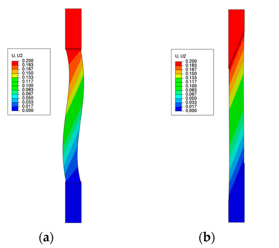 Representative deformation contour plots of 15° off-axis tension models are illustrated in Figure 3. Significant in-plane bending deformation was induced by the off-axis loading in the specimen with regular end-tabs. The oblique end-tab neutralized the bending moment and produced a uniform displacement field.