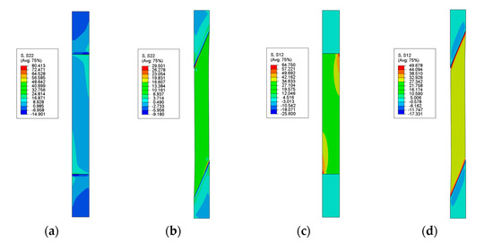 Figure 4c,d illustrates the simulated shear stress contour plots of the 15° off-axis tension specimen. A highly inhomogeneous shear stress field was generated in the specimen with rectangle end-tabs. Shear stress concentration points are located in the same corners as the axial stress field shows. The highest values are detected along the centre of the specimen width. The shear stresses of specimens with oblique end-tabs show uniform distribution.