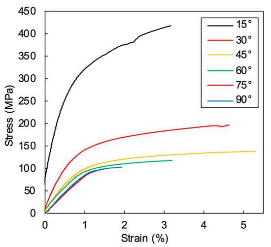 The extracted axial stress-strain curves are shown in Figure 6. All specimens exhibit significant nonlinear behaviour. The 15° off-axis tension specimen shows a linear stress-strain relationship before the stress increased to 250 MPa. As the stress mounts, the specimen shows a nonlinear response. The failure strength of the 15° off-axis tension specimen is prominently higher than the other specimens. An explanation is that when the fibre misalignment angle is smaller than 15°, fibre is the primary load bearing constituent, and the tension/shear coupling effect of the matrix is suppressed. Thus, the 15° off-axis specimen shows brittle behaviour with an elongation after fracture of 3%. When specimen off-axis angles are between 30°~60°, the stress-strain curves exhibit a linear relationship before the strain reaches 1%. The mechanical response then changed into a strain-hardening phase as the strain increases rapidly, and the stiffness decreased gradually until the final fracture. The 45° off-axis specimen has the largest failure strain of over 5%. Other than the brittle thermoset epoxy [17], the thermoplastic matrix demonstrates elastic-plastic behaviour. The 75° and 90° specimens have similar stress-strain relationships. The specimen elongation during the strain hardening stage is relatively short, indicating a decreased plastic deformation.