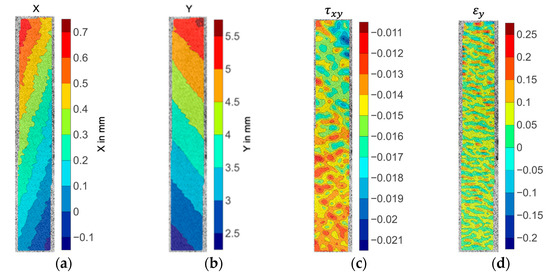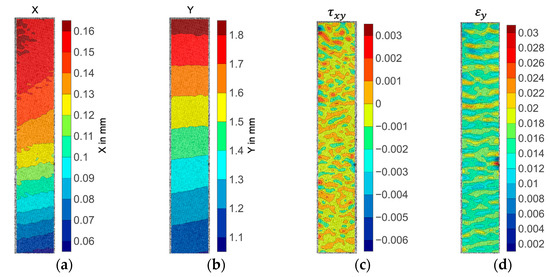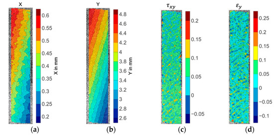 Figure 8a,b depicts the representative displacement fields in the X and Y directions before the failure of the 15° off-axis tension specimens. The deformation in the Y direction is significantly higher than that in the X direction. The distribution of displacements has a high degree of uniformity. No distortion is generated along the width of the specimen compared to the report by Merzkirch and Foecke [27]. The strain fields show non-uniform distribution with scattered strain concentration points. The highest strain in the Y direction appears in the bottom left of the specimen and coincides with the final fracture location. The shear strain fields show homogeneous distribution. Few shear strain concentration points appear at the right edge of the specimen. The shear damage process of the matrix is affected by the coupled tensile stress, leading to discontinuously distributed strain fields. The displacement and strain fields of the 15° off-axis tension specimen, validate that by using oblique ted-tabs, the shear-induced in-plane bending moment is erased and a homogeneous stress state is ensured.