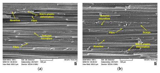 Figure 11a shows the fracture surface morphology of the 15° off-axis tension specimen. The shear stress dominated fracture surface is smooth and led to a small part of fibre fractures. The fibre surfaces are sleek due to fibre/matrix debonding under shear loading. The surface of the matrix reveals riverline, textured microflow and matrix plastic deformation features, implying the plastic behaviour of the matrix.