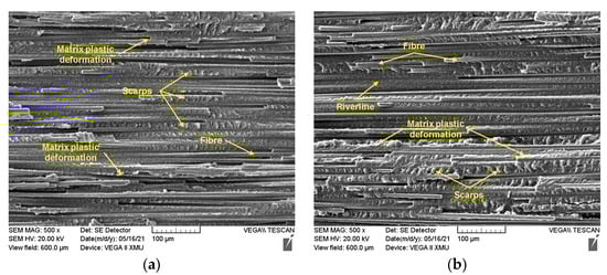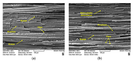 Figure 11b is the SEM image of the fractured 30° off-axis tension specimen. As the off-axis angle increased, the tension stress component within the matrix increased. The fractured surface exhibits scarps, riverline and a larger amount of matrix plastic deformation under a tension/shear combined stress state. The tension/shear coupling effect leads to increased plastic fracture features. Fibre fractures can also be identified owing to tension loading.
