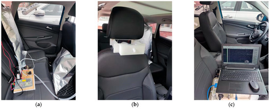 Before conducting the gas detection test in the cabin, we discussed the details of the experiment. According to the results of flow field analysis and the optional positions provided by the automobile manufacturer, the air inlet of the electronic nose was selected to be located at the trim panel of the main driver’s side door [30]. In order to obtain the data when the driver or passenger is drunk, there are three options for the location of the air outlet of the simulated expiratory device: the driver’s seat, the passenger seat, and the driver’s back seat. The laptop and the primary portion of the electronic nose were set down on the driver’s seat. The addition of volatile gas interference from liquor was achieved by pouring 50 mL of liquor on a towel and then placing the towel on the driver’s seat. The addition of perfume volatile gas interference was realized by spraying perfume onto a towel and then placing the towel on the driver’s seat. The electronic nose sensor array was heated beforehand for more than 30 min.