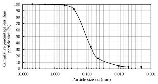 The subgrade silty sand was obtained from Songyuan County of Jilin Province. The particle analysis test results and the basic physical properties of cemented silty sand are presented in Figure 1 and Table 1, respectively, based on the Chinese specification of JTG 3430-2020, Test Methods of Soils for Highway Engineering [42]. Based on the previous research of our team, the optimal cement content of stabilized silty sand is a 2% dosage [43]. The cement content is measured by the percentage of cement in the mass of the dry soil, as Chen et al. [44] proposed. From Table 1, the initial water content of plain soil is 5.47%. The specific gravity obtained by the pycnometer test is 2.68. The liquid limit and plastic limit are obtained by the liquid–plastic limit combined test method. The optimum water content of plain soil is 8.53% and that of cemented soil is 9.69%. The maximum dry density of them, which was tested by the heavy compaction test, is 2.030 g/cm3 and 2.042 g/cm3, respectively. The coefficient of uniformity, , and coefficient of curvature, , of plain soil are 5.8 and 1.33, respectively. In summary, the plain soil is a well-graded low liquid limit silty sand classified by the Chinese specification of JTG 3430-2020.