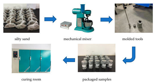 The UCS tests and STS tests both used the cylinder samples prepared in laboratories, with a diameter of 50 mm and a height of 100 mm with optimum water content, according to the impact molding method of the Chinese specification of JTG 3430-2020, the reason for using optimum water content to mold the samples is that the BF did not absorb water [45]. The fiber length selected was 12 mm [37] and unreinforced soil was taken as a comparison. Each condition is molded with five different BF contents: 0.0%, 0.1%, 0.2%, 0.3%, and 0.4% [37], where the fiber content is measured by the percentage of fiber in the total mass of the soil and cement. First, the appropriate water was added to the silty sand until it reached the optimum water content by a mechanical mixer, then stored in an airtight container for 24 h to make the internal water distribute uniformly. Subsequently, incorporating cement and BF into the prepared soil and mixed for 10 min by a mechanical mixer. Thereafter, the blend was compacted at the lowest (minimum 96%) compaction standard of high-grade highway subgrade material. After being molded, each sample was tightly packaged with plastic wrap to prevent water dispersion and evaporation during curing and to block external water sources. Then, according to the Chinese specification of JTG E51-2009, Test Methods of Materials Stabilized with Inorganic Binders for Highway Engineering [46], packaged samples were placed into a curing room with a temperature of 20 ± 2 °C and a relative humidity greater than 95% for 3 days, 7 days, 14 days, and 28 days. The preparation process is illustrated in Figure 3.