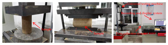 The samples prepared for UCS tests are listed in Table 3. A universal testing machine (Figure 4a) with a maximum load sensor of 100 kN, measuring error of ±1%, and control precision of ±0.5%, was used. The vertical constant loading displacement rate of 1 mm/min is applied to the sample until it failed. Then could be calculated by Equation (1).