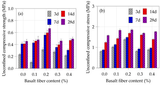 As Figure 6b presented, the UCS of BFCSM increases first and then decreases with the increasing fiber contents, which is coincident with the conclusions of Cao et al. [41]. The UCS of SM2P0B is 1.58 Mpa, the corresponding UCS of SM2P0.1B, SM2P0.2B, SM2P0.3B, and SM2P0.4B is 1.16 times, 1.17 times, 1.07 times, and 1.12 times that of SM2P0B, manifesting that BFCSM reaches the maximum strength at 0.2% dosage, which is the optimal dosage for BFCSM. Since the fiber content is higher than 2% dosage, the pull-out effect of fiber is obvious under compressing, which leads to a decrease in strength. The UCS of SM2P0.2B at 3 days is 1.39 Mpa, the corresponding strength at 7 days, 14 days, and 28 days is 1.07 times, 1.21 times, and 1.33 times that at 3 days, the increasing amplitude between adjacent curing time is 7.16%, 13.22%, and 10.00%, respectively, implying that the UCS of SM2P0.2B has the maximum increasing amplitude after curing for 14 days.