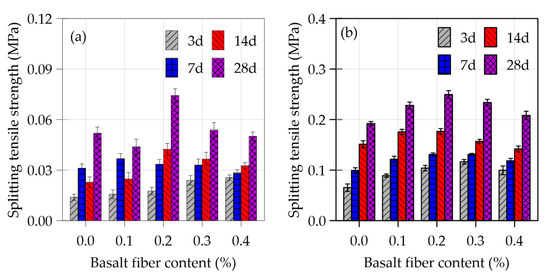Splitting tensile strength of reinforced silty sand at varying BF contents and curing time with a length of 12 mm: (a) BFUSM and (b) BFCSM.