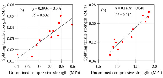 Correlation between unconfined compressive strength and splitting tensile strength: (a) BFUSM and (b) BFCSM.