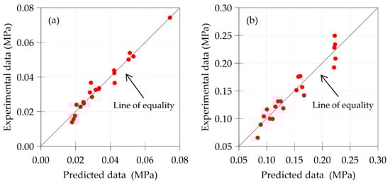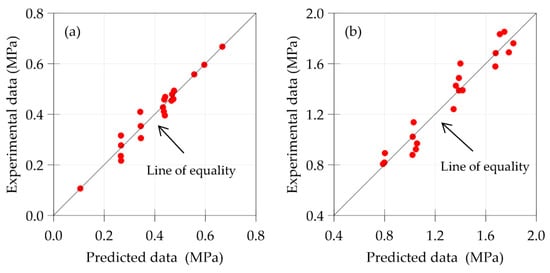 The value of MNLR models for BFCSM (0.967 for Equation (11)) is higher than that for BFUSM (0.859 for Equation (10)), indicating that the correlation between fiber contents, curing time, and is better than that with . The influence of variables on is more evident. However, the p-value of coefficients associated with B2 is larger than 0.05 in Table 5, showing that the variables of B2 could be eliminated. Therefore, the developed MNLR models are displayed in Equations (12) and (13), respectively. From Equations (12) and (13), the coefficients of variable BD in the developed models are 0.0006 and 0.0020, respectively, manifesting that the interaction between fiber contents and curing time on the STS is significant. Meanwhile, the value in the developed models is a little higher than the initial models and the p-values of coefficients corresponding to variables are both less than 0.05 in Table 5, showing that the developed models predict the STS more ideally. At the same time, the relationship between experimental data and predicted data is good as Figure 10 displayed, illustrating that the developed MNLR models are more suitable to predict and .