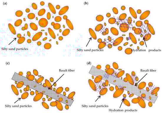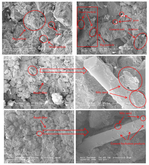 From Figure 11e,f, after the inclusion of BF and cement, the silty sand and hydration products are both attached to the surface of the fiber together, forming a better connection in the cement-soil skeleton, which enhances the interaction between the silty sand, cement, and fiber. The particle integrity is further improved, the pores are further decreased, and the strength is further significantly improved by the combined effect of physical action and chemical action. The whole is still presented as a “flocculation structure”. The schematic diagram is shown in Figure 12d.