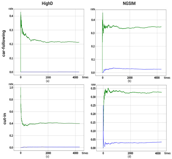 - The value of is determined by naturalistic driving data (NDD) to reflect the probability of exposure. NDD describes the natural driving environment and can provide exposure information. By analyzing the samples in NDD, we can obtain the frequency of state as and the frequency of completing an action in the current state as . Therefore, can be defined as: