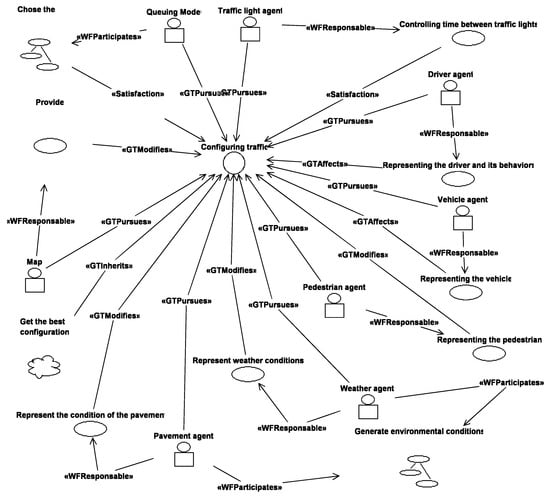 To represent the simulation model, the agents, their tasks, responsibilities and purposes, diagrams of the agent-oriented methodology, built with the INGENIAS software, IDK 2.7 [41,42], are used. Figure 1 shows a static view of the agents and their respective responsibilities and purposes. A dynamic view of the agent-based model is shown in Figure 2. The static view places all agents within the model with their purposes and responsibilities. The dynamic view relates these agents, showing, in addition, all the tasks of the simulation with their responsible and participants.