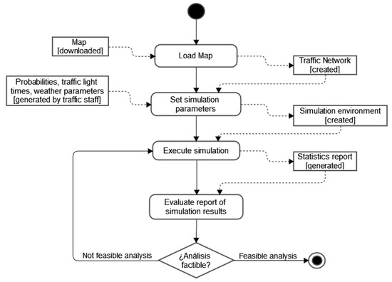The simulation is executed in simulation software developed by the authors. It contemplates the whole process from the capture of the map data to the analysis of the results obtained by the simulation. Figure 4 shows the diagram of the tool’s activities (https://github.com/amoreno98/simulation-model-data/blob/main/simulation.rar (accessed on 25 February 2022)).