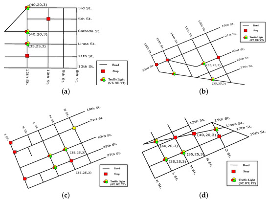 Figure 5 shows the street and signal distribution for the four instances analyzed, which are taken from real streets in the town of Plaza, Havana, Cuba. The instances were chosen because of the variability in the distribution of the existing signals.