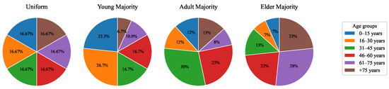 Each instance is evaluated with four different age configurations. Figure 6 shows the percentage relation of the number of people in the simulation for each age range. The first distribution contains a uniform proportion of each age group. The next configurations consist of a majority presence of young people, adults and elderly people, respectively.