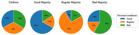 Similarly, every instance evaluates four configurations corresponding to the pavement condition. Figure 7 shows the percentage relation of the number of streets in the simulation for each pavement condition. In this case, a first uniform distribution is also conceived. The following represent the majority presence of streets in good, regular and bad condition, respectively.