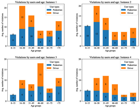 Instance 3 does not follow the same behavior as any of the other instances. Here, the highest number of violations were committed in the 46–60 age group. These violations were mostly improper overtaking by drivers and improper crossing by pedestrians. This is due to the fact of 75% of the simulated agents were familiar with the area where they were driving. This element mainly affects this age group, which is the one experiencing the most confidence on the road and committing violations for this reason. This result is unexpected for the experiment since knowledge of the area was not included in the analysis.