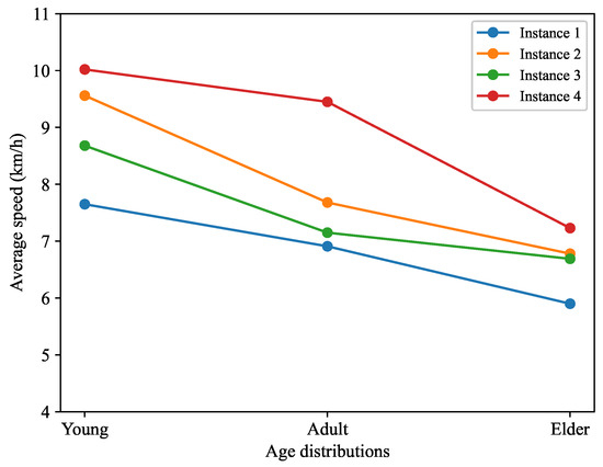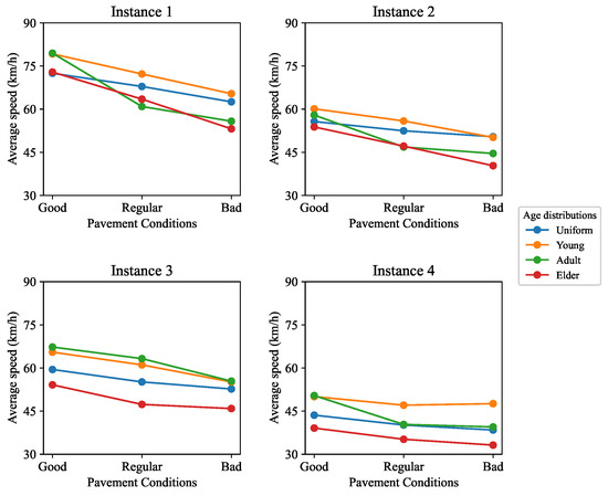 Speeding can also be found as part of the violations. The second analysis corresponds to the average speeds of pedestrians and drivers according to age and pavement condition. Figure 9 shows pedestrian speeds, average across repetitions, for each of the instances. Age distributions with a majority of young, adults, and elderly people are used to analyze speed behavior in relation to the increase in the average age of the simulation. In this case, pavement condition is not considered because pedestrians travel on sidewalks.