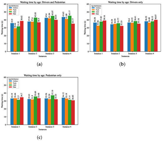 Average waiting time by scenarios: (a) Drivers and pedestrian. (b) Drivers only. (c) Pedestrian only.