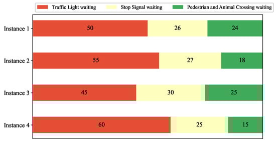 The waiting time on the road can also be due to several waiting factors. Figure 12 shows a distribution of this average waiting time for each of the instances. The main waiting factor is traffic lights, with over half of the time spent in most instances. Then, the time spent waiting at other signals and by pedestrians is similar. These last factors are not less present in the simulations, but the drivers of vehicles consider them of less importance and do not obey the corresponding waiting time.