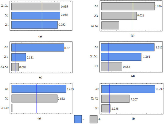 Standardized Pareto charts for the effects of the amount of goji berry (X1) and feed moisture content (X2) on the physical and functional characteristics ((a): ER; (b): B; (c): WAI; (d): WSI; (e): HD; (f): SME). The vertical line in the chart tests the significance of the effects at a level of significance = 0.05.