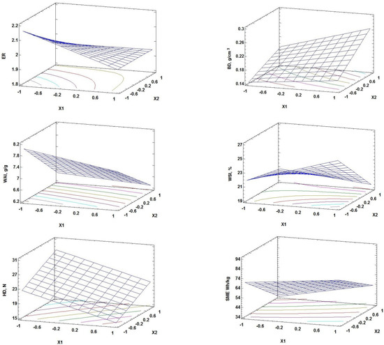 Table 2 shows the mean values, standard deviations, and statistically significant equalities/differences (between the experimental runs) of the physical and functional characteristics. The results showed that the ER varied between 1.93 and 2.15, the BD between 0.146 and 0.268 g/cm3, the WAI between 6.05 and 7.13 g/g, the WSI between 17.13 and 23.03%, the HD between 2.58 and 3.47 N, and the SME between 36.19 and 81.12 (Wh)/kg.