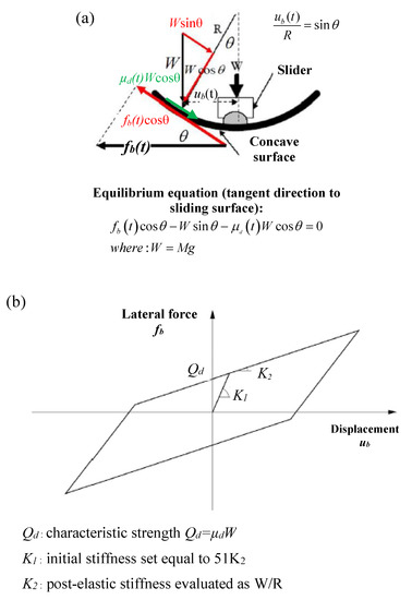 The basic response in terms of the dynamic equilibrium of the FPS device is represented in Figure 1a by means of the free-body diagram of the slider and the related equilibrium equation with respect to translation along the tangent direction to the sliding surface. After mathematical manipulation of the equilibrium equation shown in Figure 1a and assuming that the discrepancy between the normal direction to the sliding surface and the vertical one is negligible according to [11,12] (i.e., tangent direction to the sliding surface coincides, reasonably, with the horizontal one), the restoring force of the FP bearing device can be determined as follows: