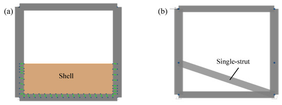 Micro-model with shell (a) and macro-model with single-strut (b) using SAP2000 for partially in-filled masonry panels.