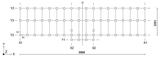 The existing RC-framed building considered for the study is located in central Italy in a region with a very relevant seismicity. In particular, according to the current Italian design code [3], the region is subjected to PGA (peak–ground–acceleration) that is superior to 0.25 g and associated with an exceedance probability of 10−1 in 50 years concerning the life safety limit state. In the next section, the main geometrical features of the building are reported, focusing on the RC-framed structure and masonry infills. The building has been realized since the 1960s according to an Italian design code that, at the time, was related to seismic design for a small part of the specifications. For instance, the structure has been realized without appropriate seismic conception and detailing. The structure, built during the 1960s, is constituted by a cast in situ RC structure that consists of orthogonal frames dislocated along X (i.e., longitudinal) and Y (i.e., transverse) directions. The foundations are stiff, inverted, continuous RC beams along the direction of the RC frames. The in-plane sizes of the building are 59.8 m in the X direction and 12.2 m in the Y direction. Figure 3 illustrates, schematically, the column disposition with the related frames identified as X1, X2 in the X direction and Y1, Y2, Y3 along the Y direction.