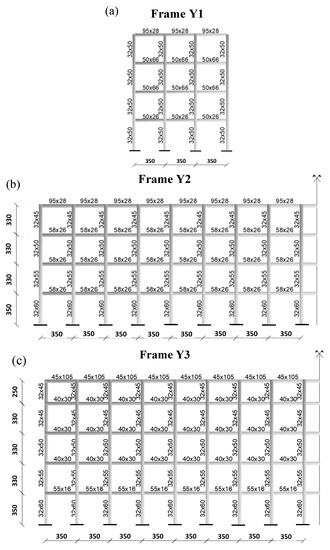 Details of the RC frames that constitute the structure, including cross-sections of main members in direction Y. Reprinted/adapted with permission from [26]. Dimensions in centimeters.