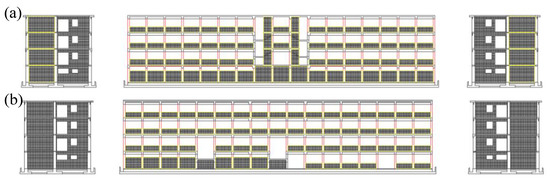 The only external masonry infills have been considered to be able to contribute to the overall seismic response of the building. In particular, the masonry infills have a total thickness equal to 34 cm and are realized with the following stratigraphy: external facing in exposed brick (8 cm); air cavity (13 cm); internal facing in perforated bricks (12 cm); and internal cement plaster (1 cm). The disposition of the partially infilled and totally infilled masonry panels within the external RC frames of the structure is reported in Figure 7. It can be noted that the geometry of the external infills in the longitudinal direction is particularly unfavorable due to the presence of many partial infill panels.