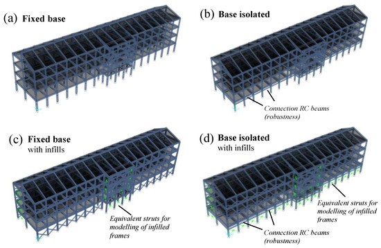 The selection of the appropriate value of R is related to the achievement of a specific isolation period Tis of the building in line with Equation (1). With reference to Section 2, the stiffnesses K2 and K1 have been determined as a function of the axial load on the specific FPS isolator device. The friction coefficient in the dynamic regime as a function of time has been modeled in SAP2000 [25] according to [30,31]. The related value has been determined in the function of the axial load applied on each device with reference to the empirical approach of [30]. The summary of the properties associated with the different FPS isolators is reported in Table 3 together with their disposition in-plane as shown in Figure 9. As reported in Figure 10, four different numerical models have been realized, differentiating between the fixed-base/base-isolated structure without masonry infills and the fixed-base/base-isolated structure with masonry infills.