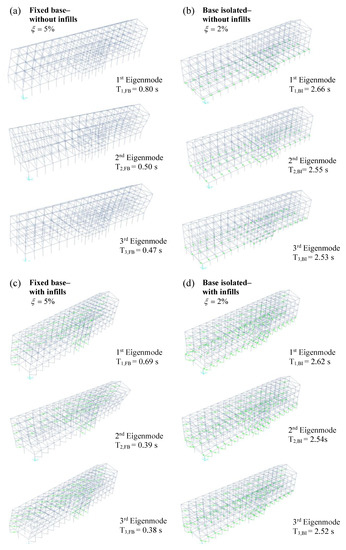 Representation of the first three eigenmodes for the fixed-base structure with (a) and without infills (c) and for the base-isolated structure with (b) and without infills (d).