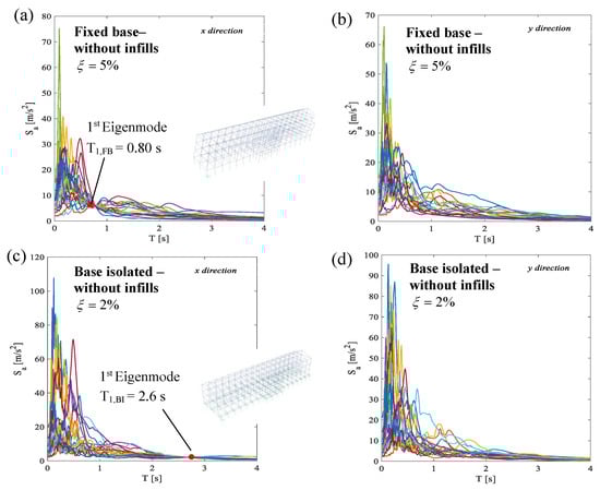 Scaled spectra of pseudo-acceleration for fixed-base (a,b) and base-isolated (c,d) building related to natural seismic inputs along X (a–c) and Y (b–d) directions. Numerical models without infills.