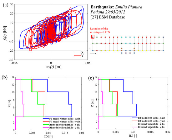 The outcome of the NL dynamic simulations has been quantified in terms of the peak value of the inter-story drift index (IDI) for each story of the building for what concerns the in-plane directions (i.e., X, Y). In Figure 15a, the response of the corner FP device (that turns out to be the most critical one) to the seismic excitation associated with one of the scaled seismic inputs (i.e., the earthquake of “Emilia Pianura Padana 29 May 2012”) [27] (that corresponds to the EQ5 with reference to the database reported by [26]) is reported to demonstrate its agreement with the theoretical model of Figure 1b. In the force–displacement graph of Figure 15a, the irregularity of hysteresis cycles is due both to the variability of the dynamic coefficient of friction with the sliding velocity and to the effects induced by the vertical accelerometric component of the seismic record. Moreover, in Figure 15b,c, the IDIs, computed as average values between all the seismic records, are reported as a function of the building height from the foundation level for each numerical model herein considered. It can be recognized that the IDIs along the Y axis are smaller if compared to the ones along the X axis due to the different stiffness of the frames oriented in the Y and X directions, respectively. The results show a significant reduction in the IDIs in the presence of the isolation system, demonstrating its usefulness also in the case of irregular buildings. Comparing Figure 15b,c, the increase in stiffness can be appreciated due to the presence of masonry infills.