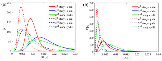 Mono-variate log-normal distribution (PDFs) related to the IDIs oriented in X and Y direction: fixed-base model (a), base-isolated model (b); (without masonry infills). Reprinted/adapted with permission from [26].