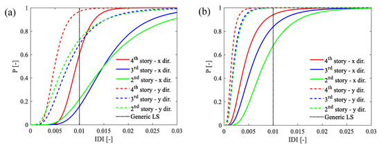 Mono-variate log-normal distribution (CDFs) related to the IDIs oriented in X and Y direction: fixed-base model (a), base-isolated model (b); (without masonry infills). Reprinted/adapted with permission from [26].