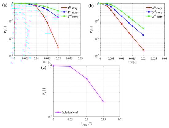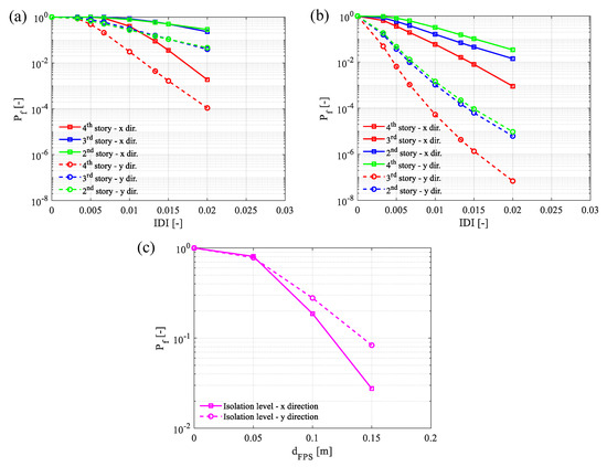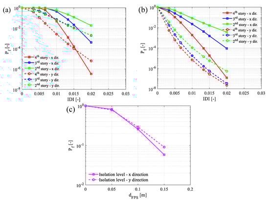 In particular, Figure 17a,b illustrates, respectively, the mono-variate lognormal probabilistic and cumulative distribution functions of the dFPS including both the X and Y directions, for the base-isolated building (without masonry infills). First of all, it is shown that the horizontal displacement and the interstory drift index in the X direction are considerably larger than in the other direction, being less stiff in that direction. In addition, it is demonstrated that the retrofit allows a reduction in terms of the probability of exceedance Pf of the defined limit state. The exceedance probabilities for the isolation level and for both the fixed-base and base-isolated buildings (without masonry infills and considering the different stories) are shown in Figure 18a–c. It is shown that the isolation technique is able to decrease the IDIs and, thus, to significantly reduce the probability of exceedance if compared to the non-isolated structure.