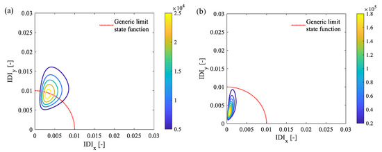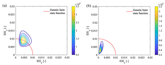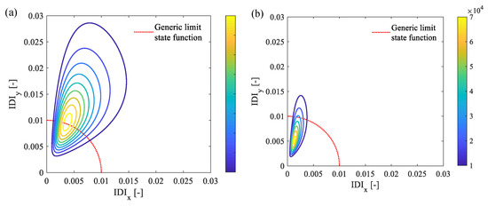 As far as the probability of failure in the case of jointly distributed variables is concerned, it must be calculated by integrating the generic JPDF, , where ZX denotes IDIx or dFPSx whereas ZY denotes IDIY or dFPS,Y. Figure 21, Figure 22, Figure 23, Figure 24, Figure 25, Figure 26, Figure 27 and Figure 28 illustrate mainly the level curves of the joint PDFs, together with a certain limit state area, considering the cases with and without masonry infills and for both fixed-based and base-isolated buildings. For example, regarding the superstructure, only results related to the 4th story and the 2nd story are presented.
