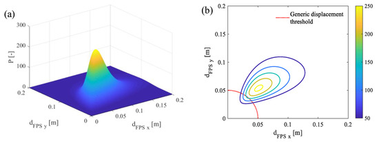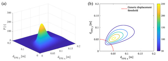 Three-dimensional view of the joint PDF for the isolation system (a) and level curves (b) with a generic displacement threshold (with masonry infills).