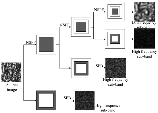 The NSST first decomposes the source image by K-layer NSPF to obtain the sub-band images with the same size as the source image, including K high-frequency sub-bands and 1 low-frequency sub-bands. After multi-scale decomposition, the high-frequency sub-bands are decomposed with SFB for direction localization to obtain high-frequency coefficients in different directions. Figure 2 shows a three-stage flow chart of NSST decomposition.