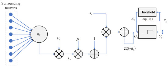 PCNN is the earliest neural-network model based on the cat vision principle, which has global coupling and pulse synchronization. PCNN is based on iterative computation and can extract effective information directly without learning and training. The application of PCNN in image processing is usually a single-layer network with two-dimensional array input. There is a one-to-one correspondence between the input image pixels and PCNN neurons, so the number of neurons is equal to the number of pixels. Each neuron relates to adjacent neurons for information transmission and coupling. There are five parameters in the PCNN model that need to be set by yourself, including the attenuation coefficient, the link strength, and so on [29]. The PAPCNN model is shown in Formula (1):