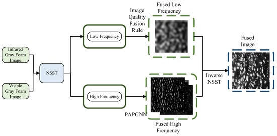 Then, the fused image F is obtained by performing the inverse NSST on . The image fusion flow chart is shown in Figure 5. The low-frequency fusion method proposed in this paper performs a quality assessment on the low-frequency image to determine the fusion weight of the low-frequency image. The fused low-frequency image not only retains the detailed background information but also highlights the foam target. So, the fused foam image not only contains rich texture details but also highlights the foam target. It is beneficial to feature extraction and working condition classification of foam flotation.