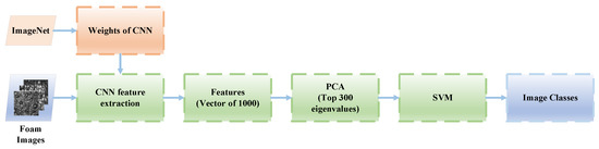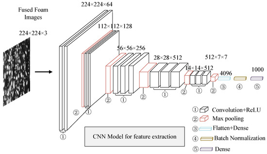 In this paper, CNN is used to extract the feature vectors of flotation froth images using a VGG16 network [34] and a Sigmoid activation function. Although a large amount of sample data provides rich information for training, it also increases redundant information, so PCA is used to reduce the feature dimension and extract the key features of the image, which can greatly preserve the data features while reducing the correlation between adjacent pixels of the image. The SoftMax classifier in CNN can only make the output data of the fully connected layer conform to the probability distribution, which cannot improve the classification effect, so the SoftMax classifier of CNN is changed to SVM for classification, and the reduced-dimensional data is used as the input of SVM for image classification. The CNN model for feature extraction is shown in Figure 6. The structure of the CNN-PCA-SVM model is shown in Figure 7. Due to the limitation of the number of datasets, training CNN from scratch does not achieve the desired effect. Using transfer learning can solve this issue [35]. VGG16 is adopted as our starting point, which is pre-trained on ImageNet.