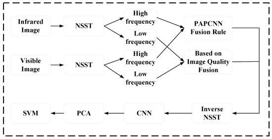 This algorithm is mainly divided into six main parts. The specific steps are as follows: 1. multi-scale decomposition of infrared and visible gray foam images using NSST; 2. low-frequency fusion algorithm based on image quality method for low-frequency sub-band images of infrared gray and visible gray images, and PAPCNN fusion algorithm for high-frequency; 3. inverse NSST fusion of fused high and low-frequency sub-band images; 4. fuse images using CNN for feature extraction; 5. reduce the dimension of the feature matrix using PCA; 6. classify the condition of the reduced feature matrix using SVM.