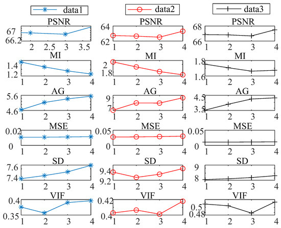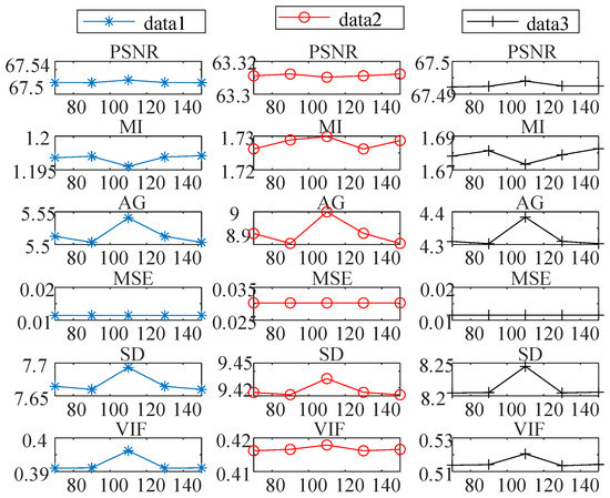 (2) Number of PAPCNN iterations, is set to 70, 90, 110, 130, and 150. The results are shown in Figure 10, where fixed K = 4. As shown in Figure 10, the sample foam images have the best performance, where data 1 has the best performance except MI at N = 110, data 2 has the best performance except PSNR at N = 110, and data 3 has the best performance at N = 110 except MI. Therefore, combining Figure 9 and Figure 10, we can get the best effect of image fusion when K = 4 and N = 110.