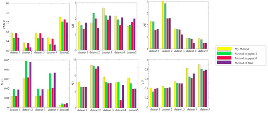 The image fusion method in this paper is compared with the method of [18], the method of [36], and the maximum fusion method. The fused image indexes are shown in Figure 11. For the PSNR, the fusion method in this paper is the best. For most of the samples, the MI index is the best. In this paper, the MSE index and the error are smaller, the fusion performance is better, and the fusion method obtains the smallest index value. The SD and VIF indices, this method is significantly better than other fusion methods. In summary, it can be concluded that the performance index of the method in this paper is better than the method of [18], the method of [36], and the maximum fusion method. The fusion method proposed in this paper has less distortion, more gradient information, less fusion error, and high contrast implying a good visual effect.