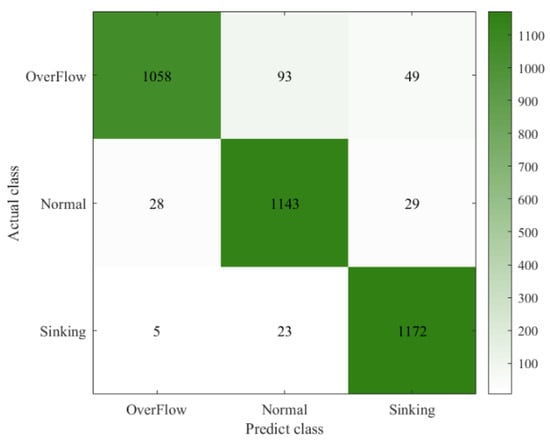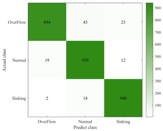 As shown in Figure 13, the confusion matrix of the 10-fold cross-validation mode is demonstrated. The classification accuracy is 93.7%. Table 2 shows performance indicators of classification considering a 10-fold cross-validation mode. Figure 14 shows the confusion matrix of the training dataset. The classification accuracy is 95.9%. Table 3 shows performance indicators of classification considering the training dataset. Figure 15 shows the confusion matrix of the testing dataset. The classification accuracy is 94.2%. Table 4 shows performance indicators of classification considering the testing dataset.